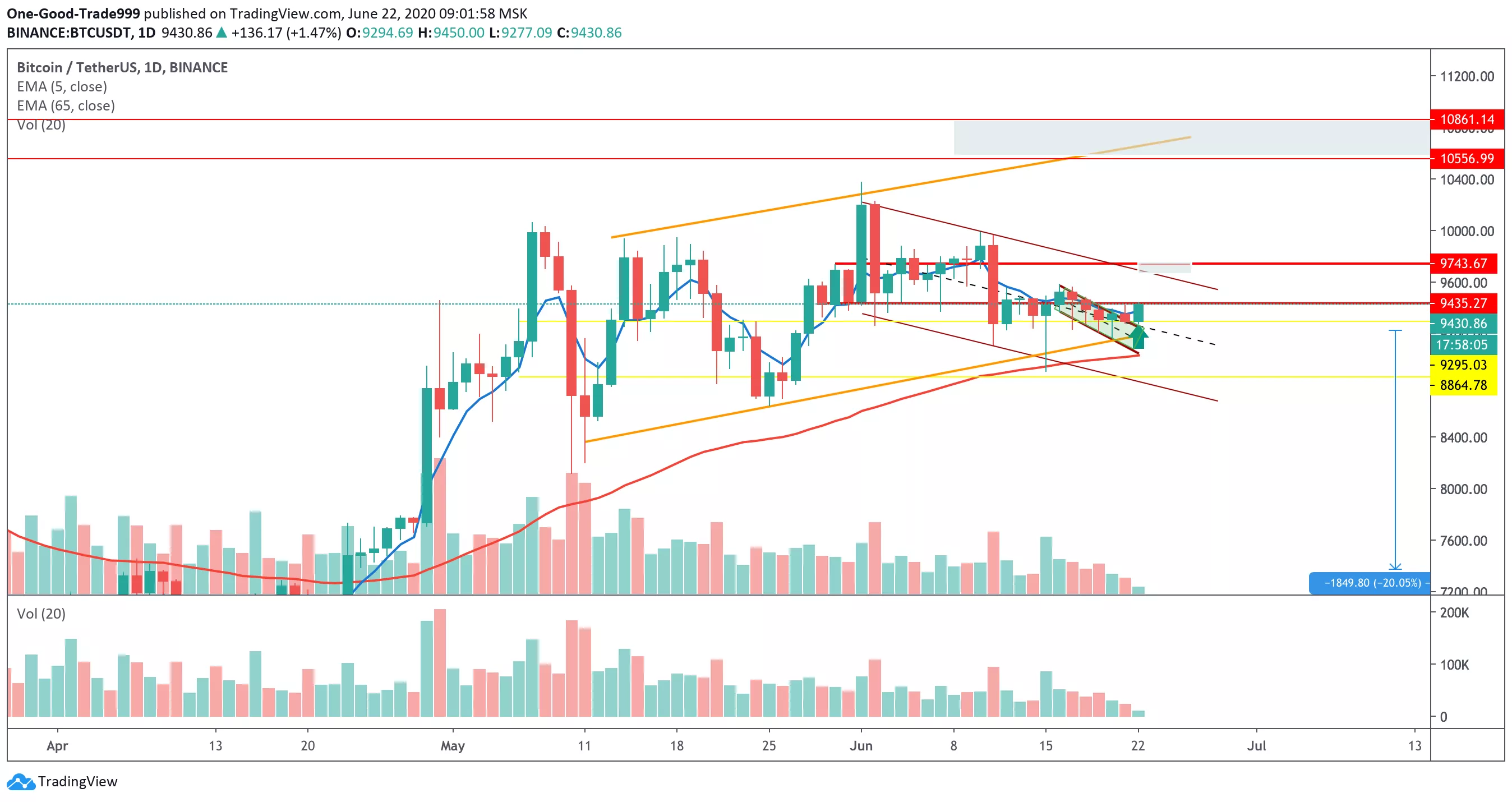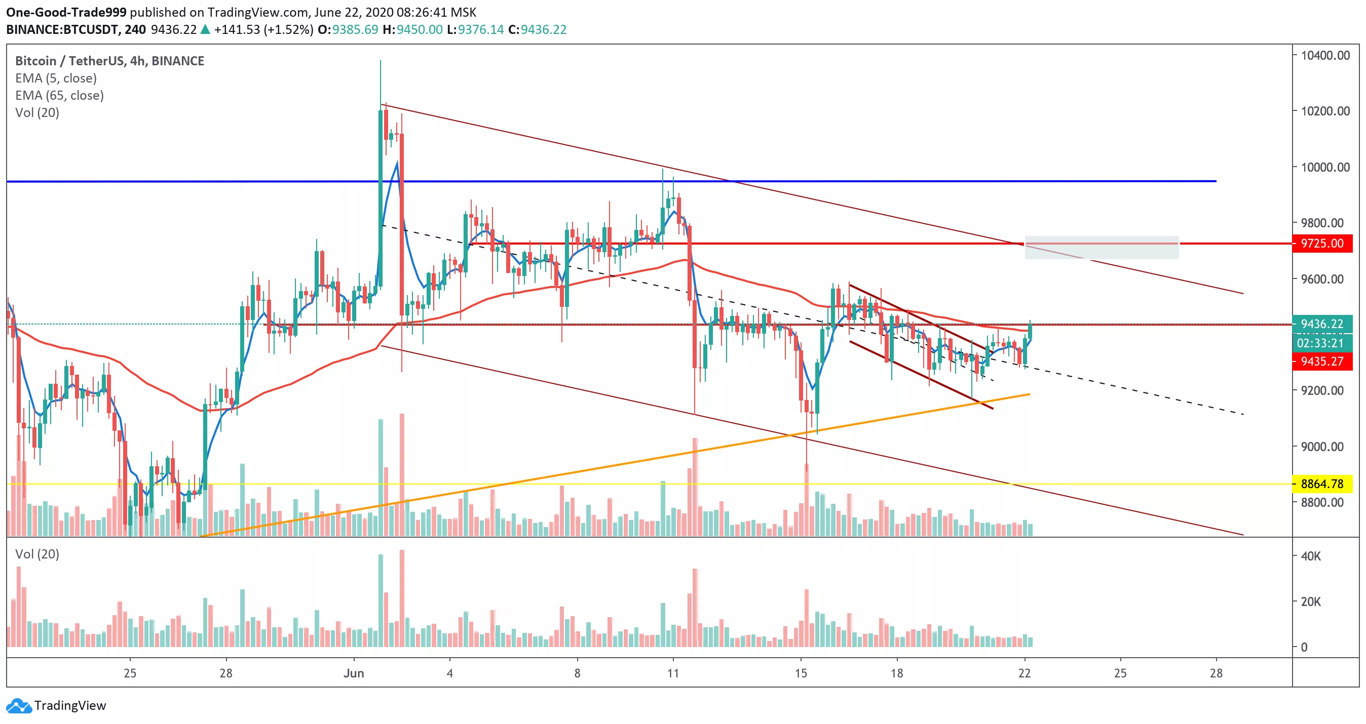 Для продолжения текущего восходящего движения необходимо удержать поддержку на $9295 (является серединой нисходящего канала и верхней границей краткосрочного нисходящего канала, который биткоин пробил на текущем росте):