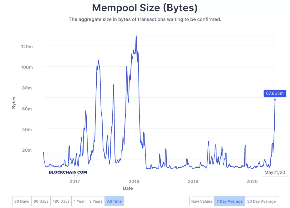 В первой половине дня резкий всплеск вернул этот показатель к состоянию на начало 2018 года. Средний 7-дневный размер мемпула достиг 68 МБ – наибольшего значения со времен ралли в конце 2017 / начале 2018 года.