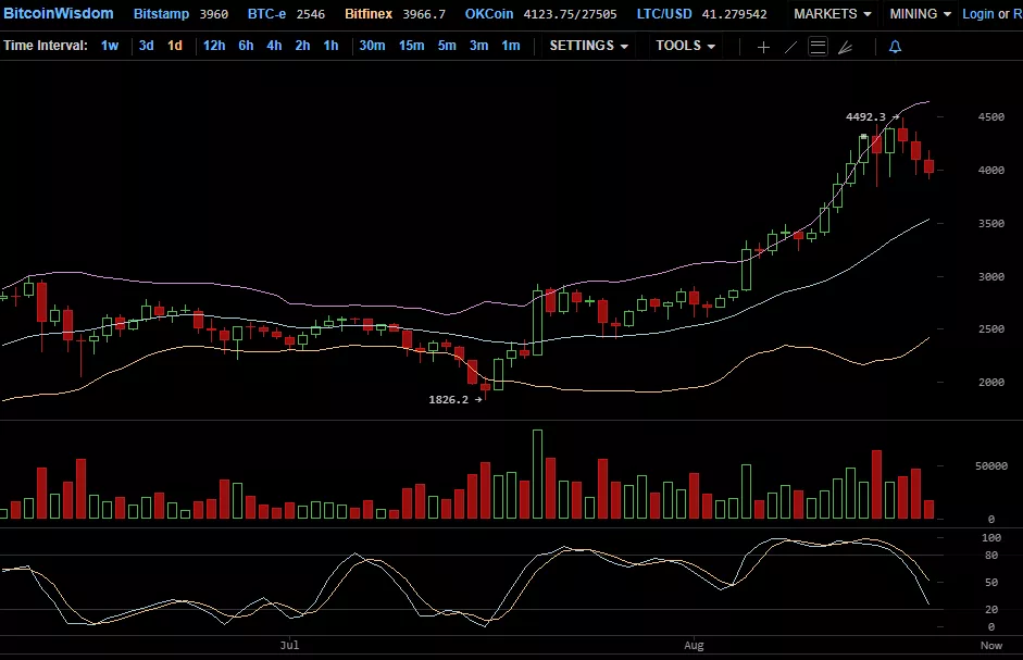 Если обратить внимание на дневной график биткоина биржи Bitfinex, то можно заметить, как после стремительного роста (во многом подкрепленного оптимизмом инвесторов в связи с грядущей активацией SegWit) цена биткоина поднималась значительно выше отметки в $4000, а затем опускалась до $3832.5 (во вторник, 15 августа).