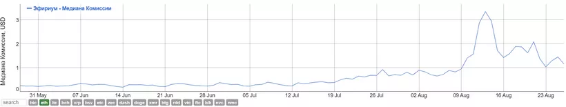 С середины августа комиссии в сети Ethereum начали снижаться, согласно BitInfoCharts. За две недели медианный показатель опустился с $3,35 до $1,16.