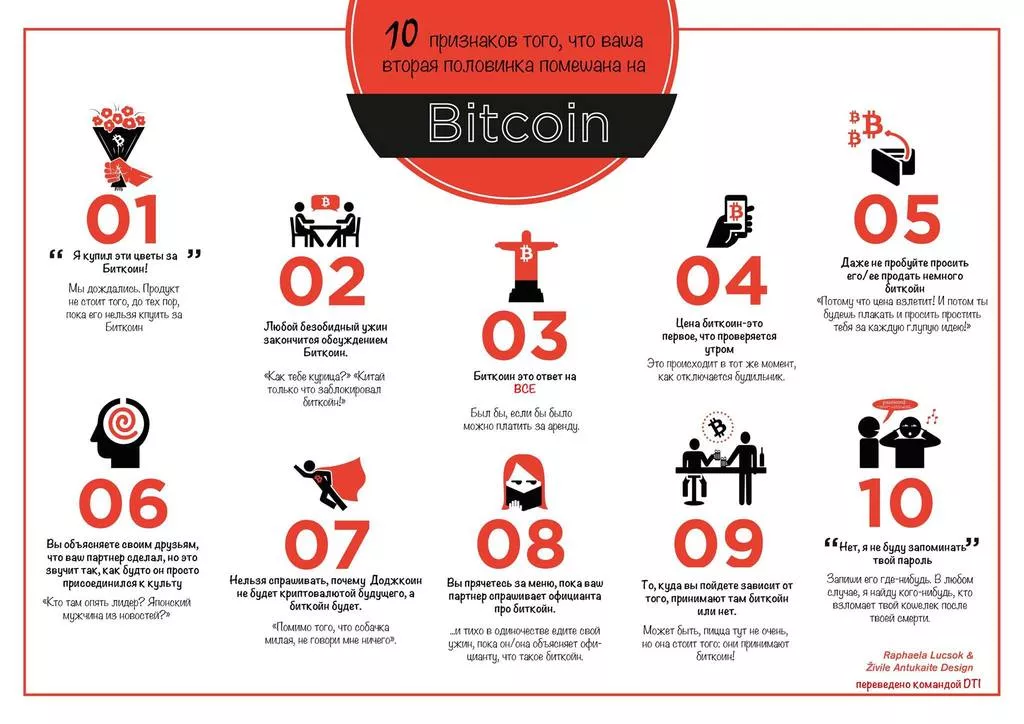 В числе десяти причин, указывающих на нездоровую заинтересованность в криптовалютах, указаны: перевод любой темы на биткоин, потеря интереса ко всему, что не связано с криптовалютами, страсть к покупкам за биткоины и другие.