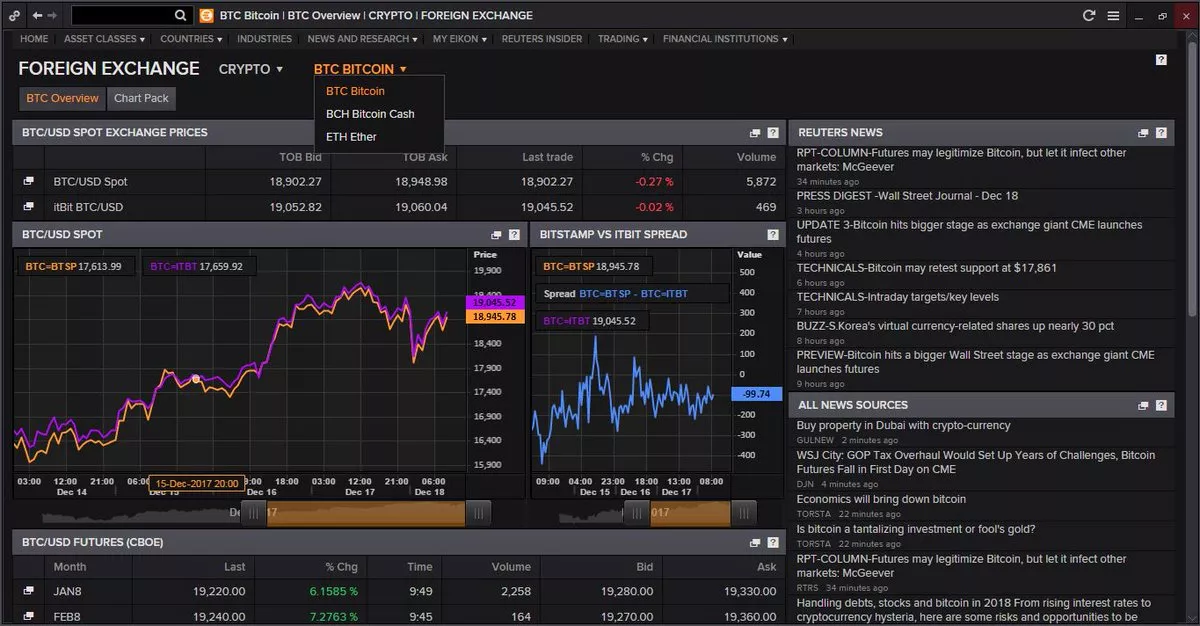 Еще в 2014 году Thomson Reuters добавила в список отслеживаемых активов BTC, данные о цене которого транслируются из биржи Bitstamp. В сентябре этого года в терминалы Eikon был добавлен индекс биткоина (Eikon Bitcoin Liquid Index, BLX), который формирует средневзвешенную цену биткоина в USD, агрегируя данные из ведущих криптовалютных площадок. Также терминал поддерживает данные по второй по капитализации криптовалюте Ethereum (ETH).