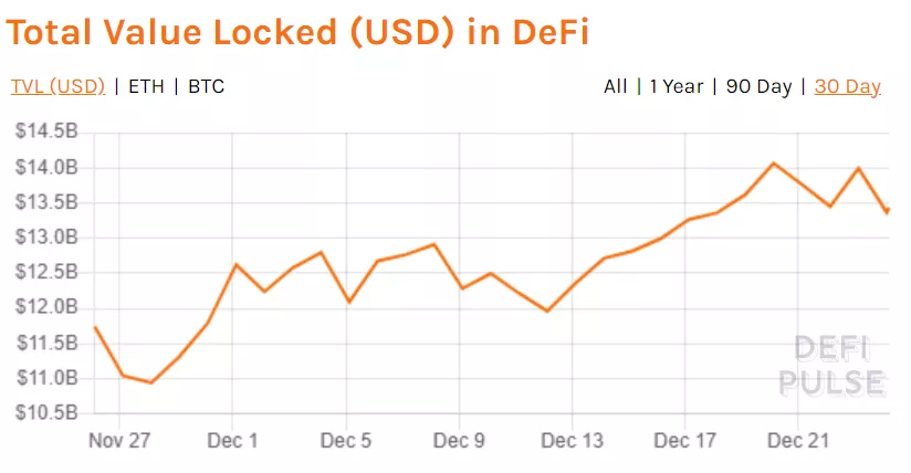 Объем замороженных в DeFi-протоколах 20 декабря превысил $14 млрд, достигнув исторического максимума по скорректированным метрикам DeFi Pulse. По состоянию на 24 декабря показатель снизился до $13,4 млрд.