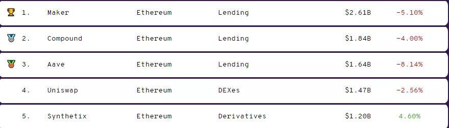 Лидерство сохраняет Maker с заблокированными активами на $2,61 млрд — индекс доминирования составляет 19,54%. Ведущая тройка не изменилась — в нее по-прежнему входят Compound и Aave.