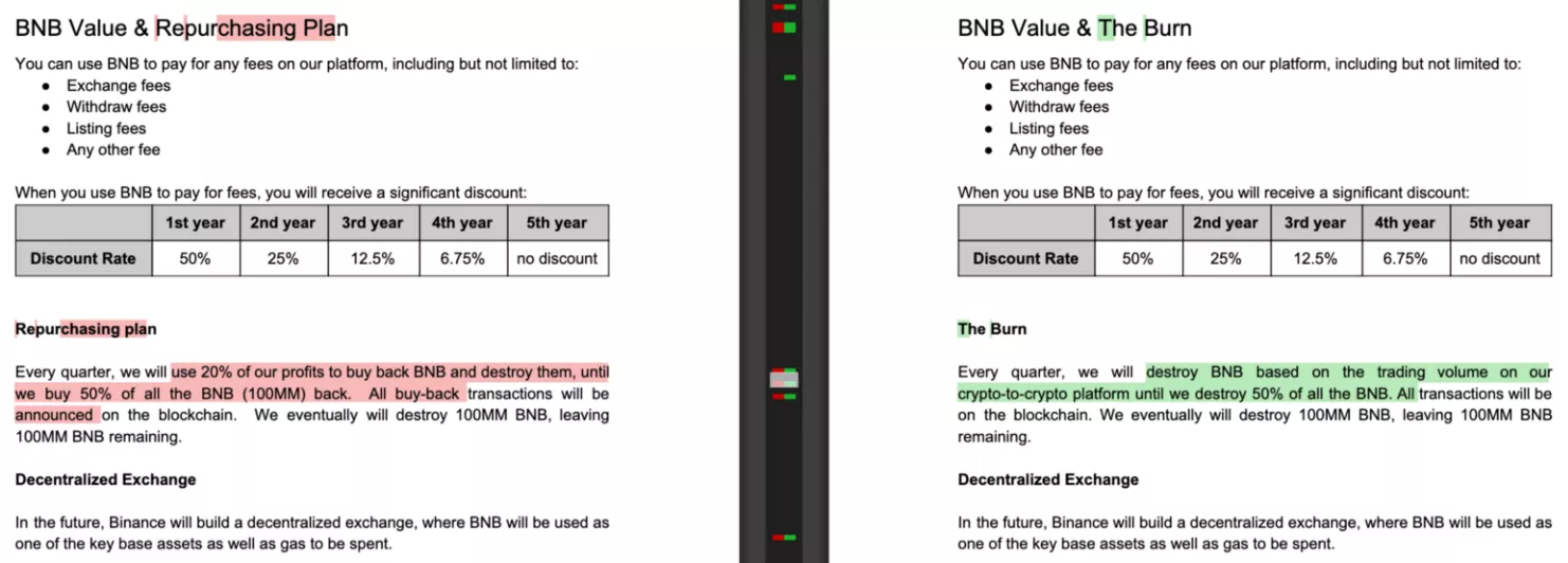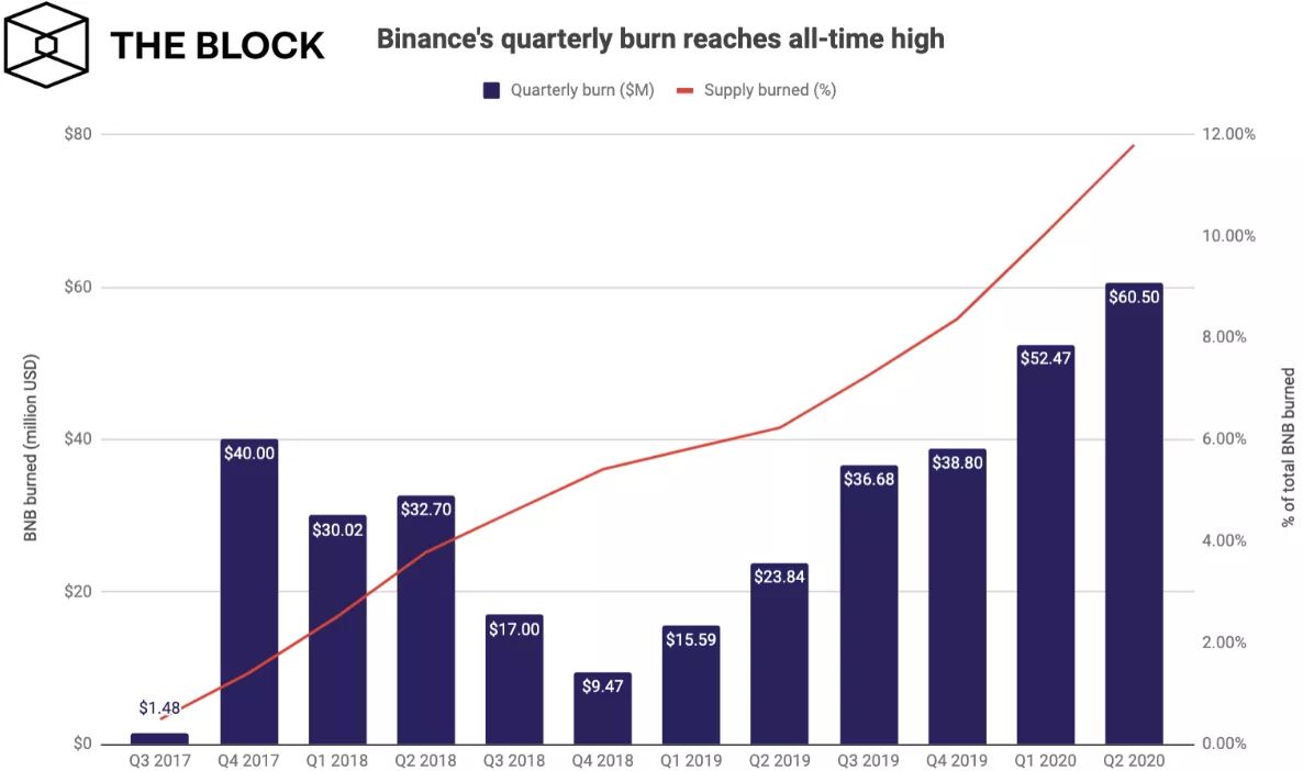 Согласно оригинальному whitepaper, для последующего сжигания биржа ежеквартально выкупает монеты BNB, соответствующие 20% чистой прибыли. Впоследствии компания обновила документ, в котором теперь говорится, что BNB уничтожается в соответствии с объемом торгов на спотовой, маржинальной и фьючерсной платформах.