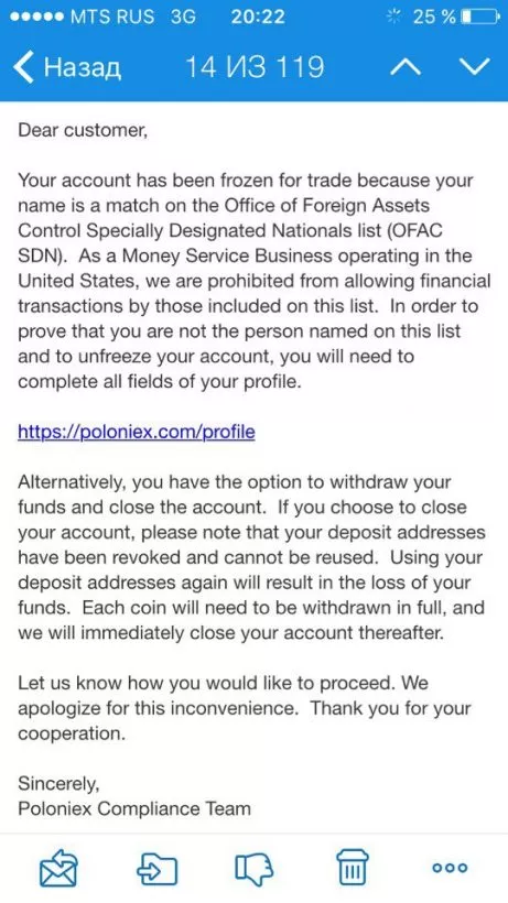 Как пояснили представители биржи Poloniex, письмо с уведомлением о том, что Poloniex больше не оказывает услуги в РФ, было автоматическим ответом на закрытие аккаунта.