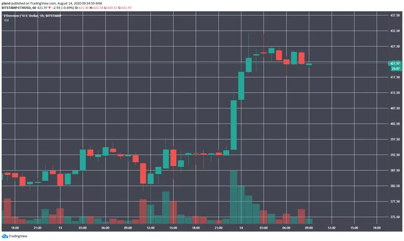 Ночью 14 августа котировки второй по капитализации криптовалюты пробили психологическую отметку $400 и закрепились над ней. В моменте цена Ethereum превышала $430 (Bitstamp).